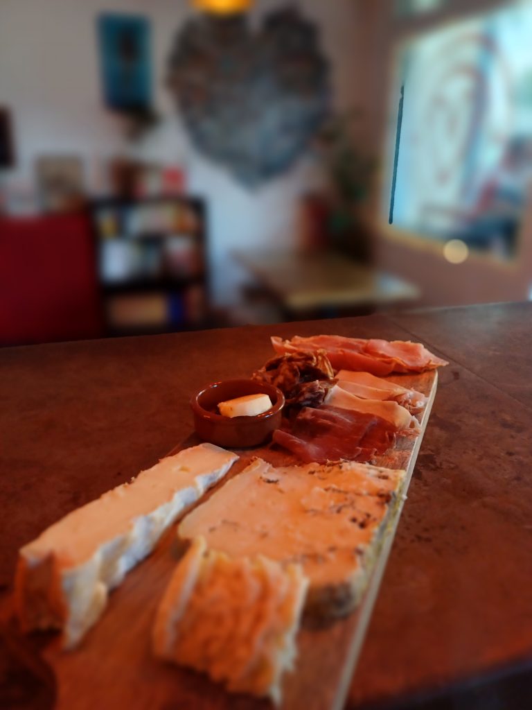 Planche Mixte Un incontournable de toute heure !Servis sur une planche, vous pourrez y trouvez une sélection de fromages (pour la plupart, issus de la Ferme Tartifume de Pessac ainsi qu’une sélection de charcuterie (pour la plupart, de cochon noir de Pessac, chez Vincent Dubourg)